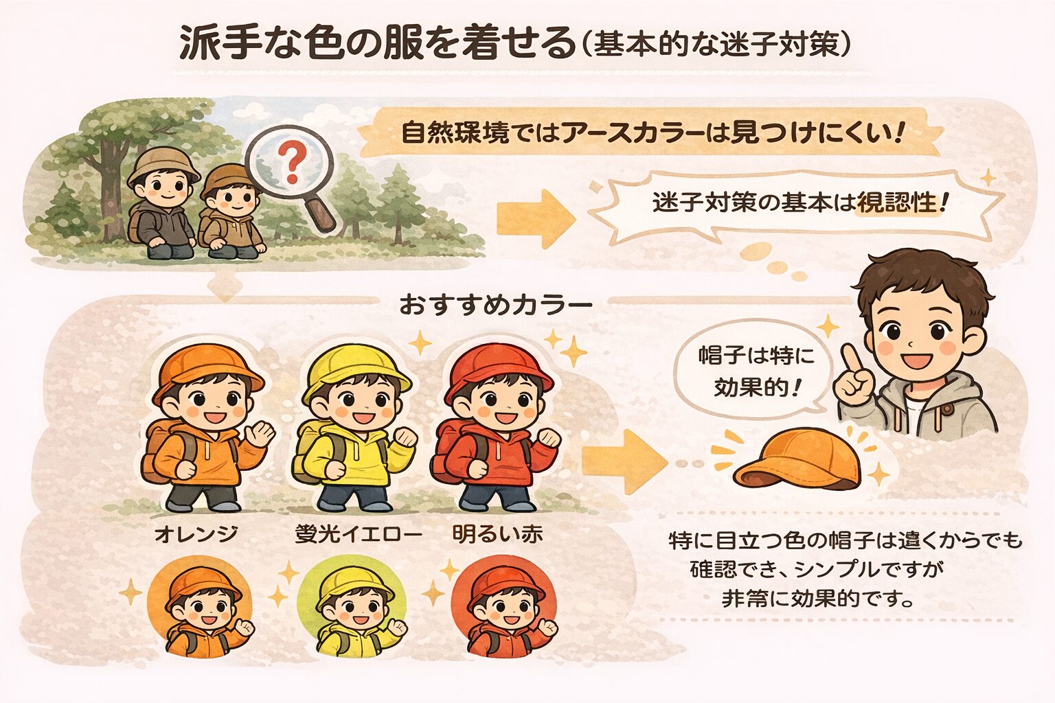 迷子対策の基本は視認性です。