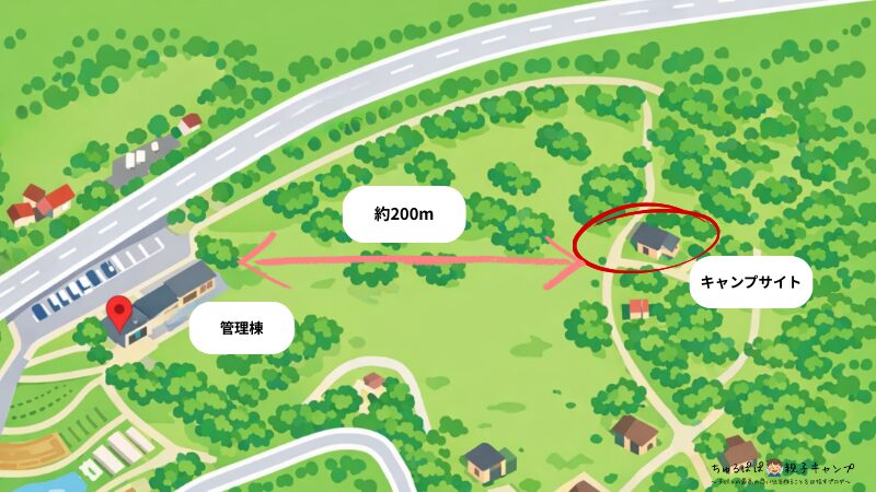 管理棟〜テントサイト(約200m)の検証では、