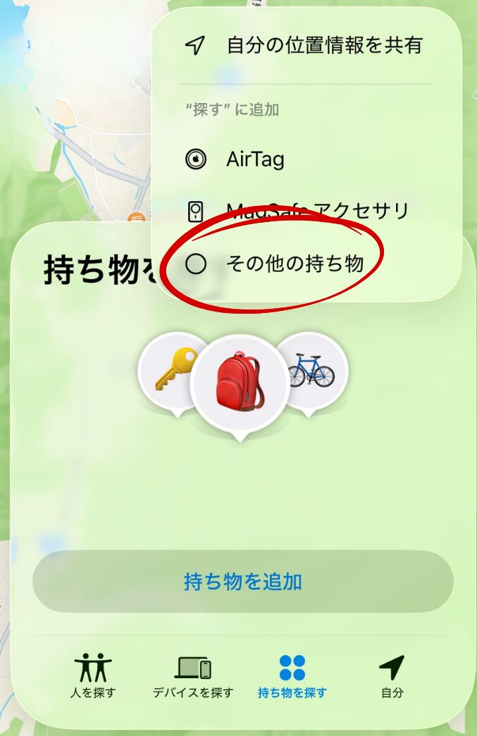 「持ち物を探す」から「AirTag」をタップしても反応しませんので注意。