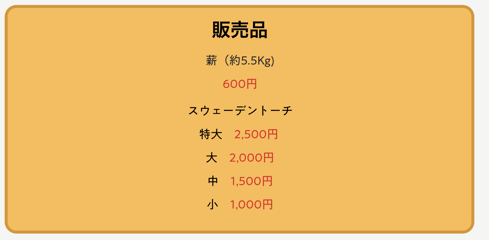受付にて薪を1箱500円で購入できます。またスウェーデントーチも販売されています。