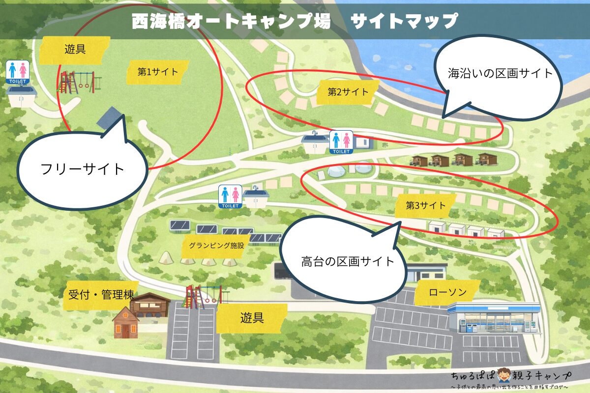 西海橋オートキャンプ場のテントサイトは3つのエリアに分かれています。どのサイトも車の乗り入れができるので、荷物が多い子連れには助かります。