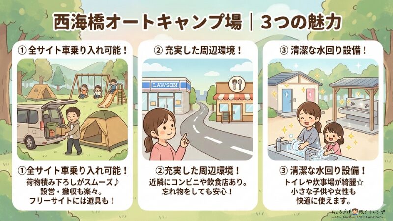 西海橋オートキャンプ場を3児のパパ視点で分析した、ファミリー向けのリアルな本音をお伝えします。