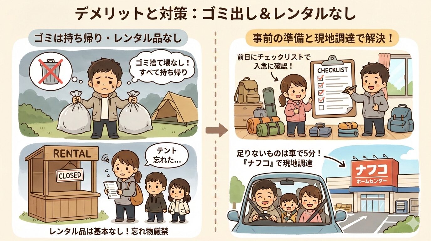 ・準備不足を防ぐ: レンタルがないため、忘れ物は厳禁。前日にチェックリストを作るか、足りないものは車で5分の「ナフコ(ホームセンター)」で現地調達するつもりでいましょう。