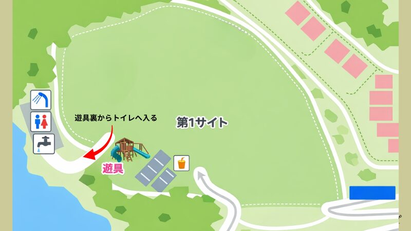 ✔ 第1サイト(広さ重視): 平坦で広く、遊具が近い。初心者ファミリーにおすすめ